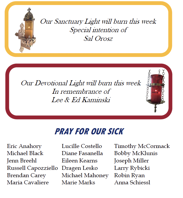 7:30 a.m. William & Anna Yarkosky 9:00 a.m. Diane Casimiro 10:30 a.m. Charles Griffen 12:00 p.m. Vincent Maiolo (1 yr. anniversary)